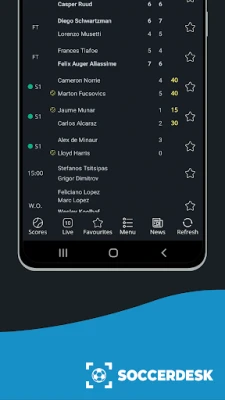 NOTIFICATIONS: are you annoyed by other live score apps sending you unwanted marketing notifications, specially in the middle of the night ? SoccerDesk is a livescore application which will only send you notifications for live football and tennis matches you follow. No marketing notifications.